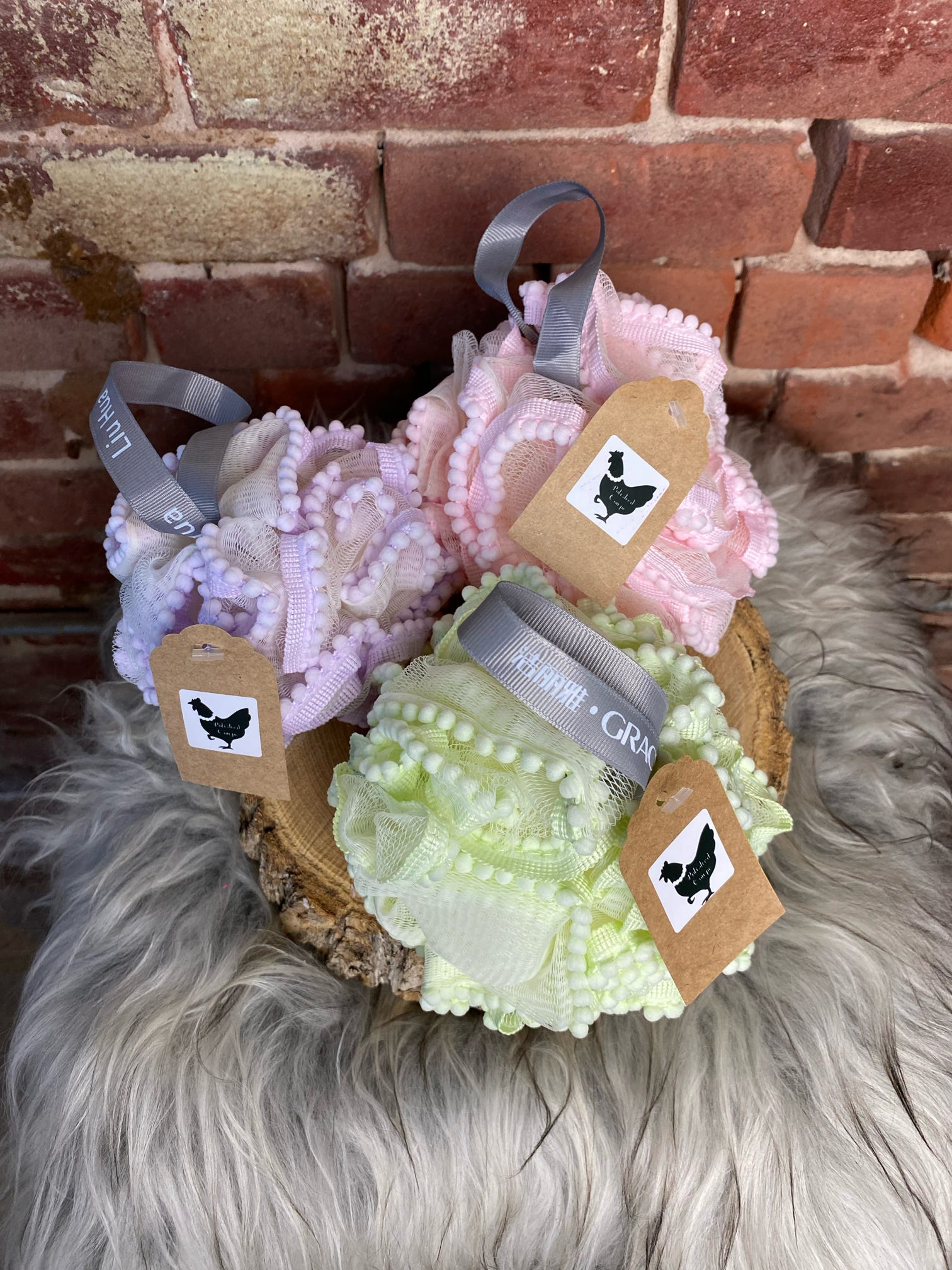 Set yourself up for a relaxing shower or bath with these super soft and fuctional poufs. Availabe in three color options.