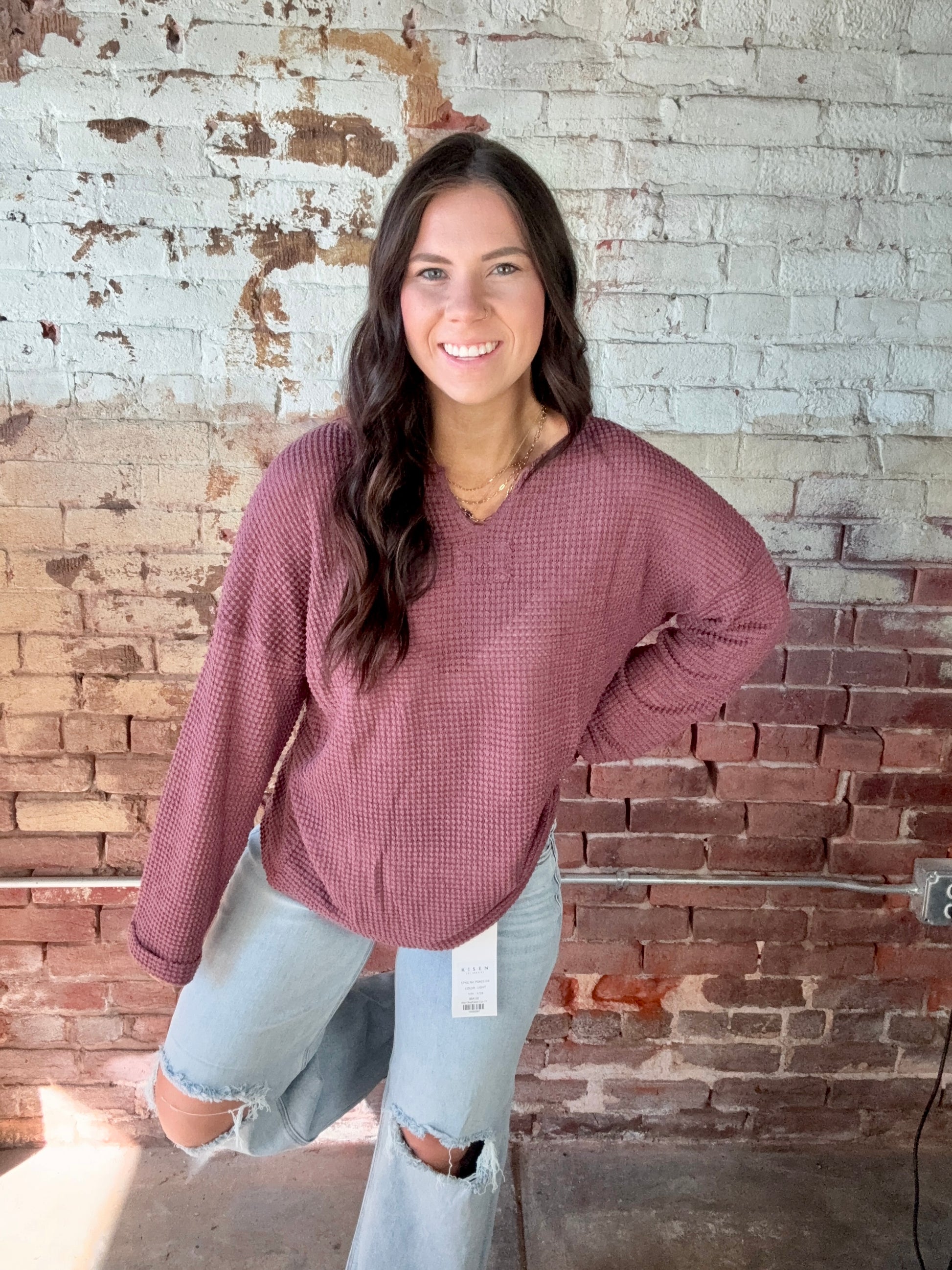 Cozy and chic, this waffle-knit top is a must-have for your wardrobe. with its relazed fit and flattering V-neck, it's perfect for those days when you want to be comfy but still look put together. Whether you're staying it at home or going out with your friends, this top will keep you feeling stylish and comfortable all day long. Fits a little oversized. 95% Polyester 5% Elastane