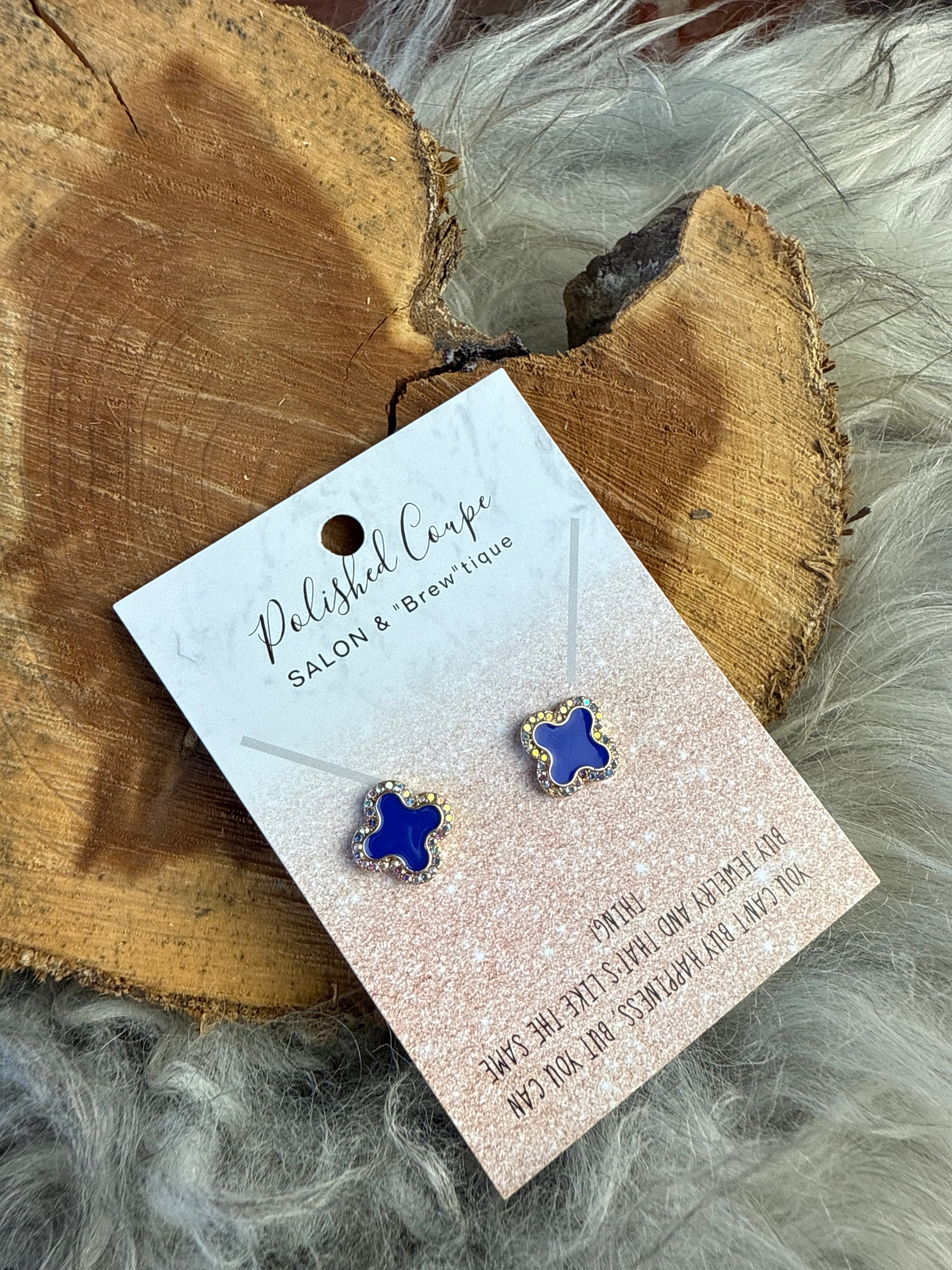 Lightweight royal blue accented by a warm gold exterior in rhinestones the perfect stud to catch an eye