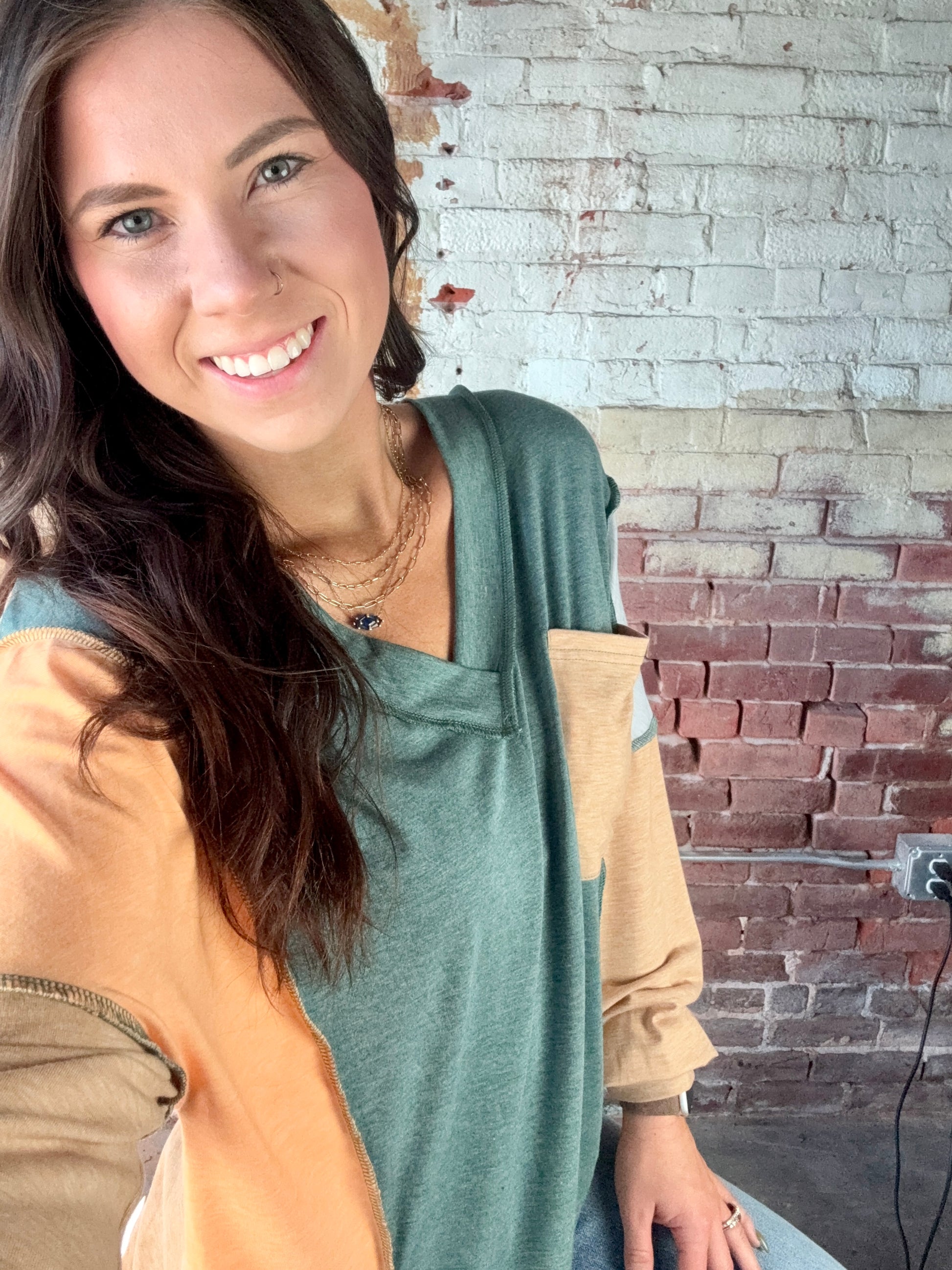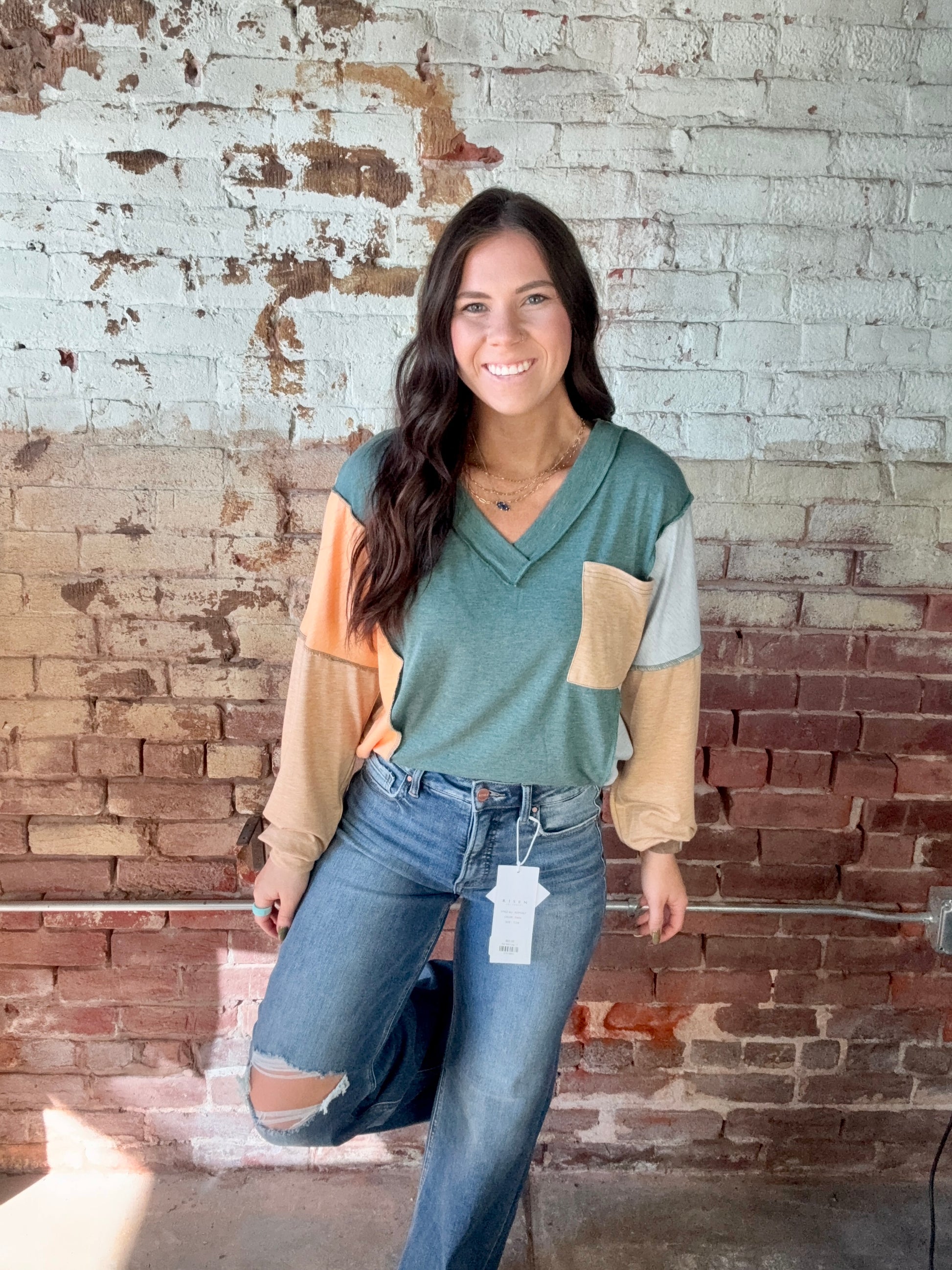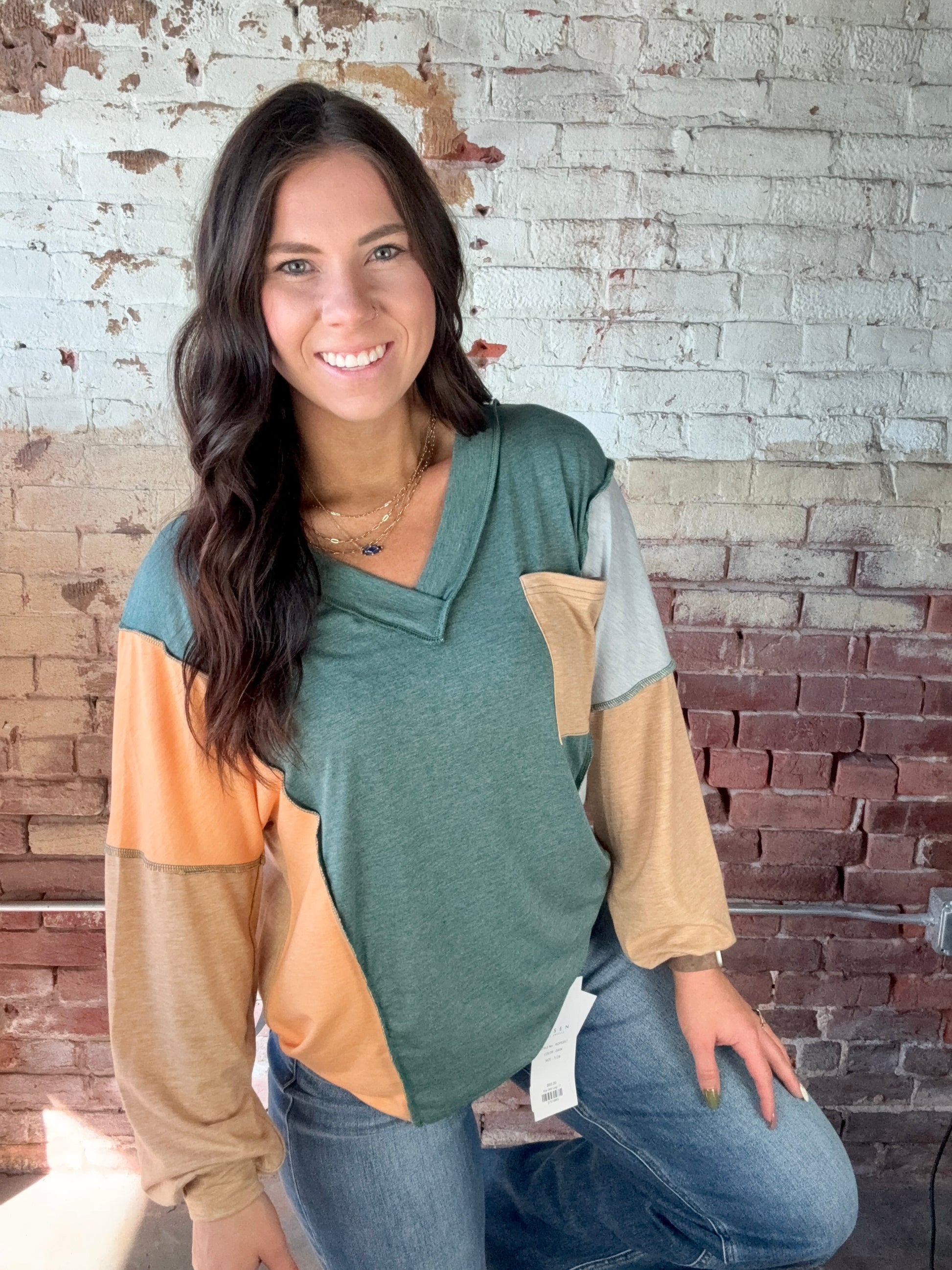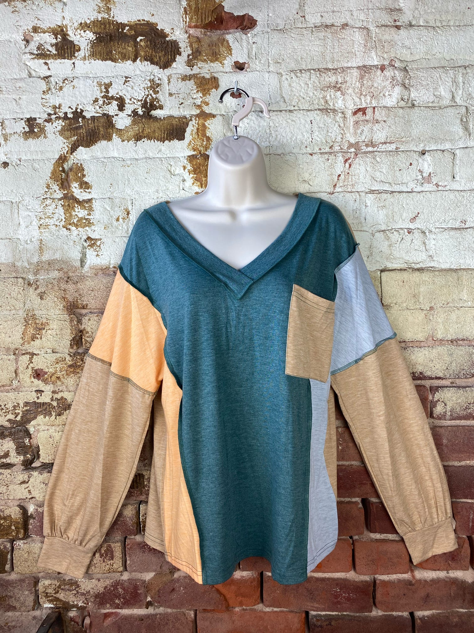 Embrace effortless style with our colorblock V-neck top. This top features a unique blend of hues in a relaxed fit. Perfect for a casual day out or a cozy evening in, this versatile piece adds a touch of modern flair to any wardrobe. Fits true to size. 75% Polyester 20% Viscose 5% Elastane