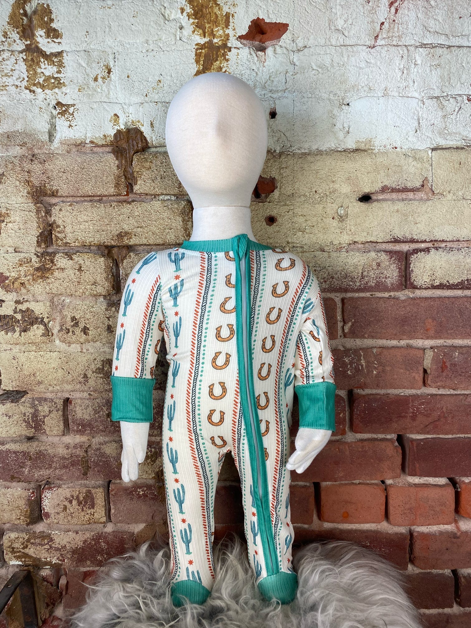 Dress your little one in western-inspired charm with this cozy romper. This features a playful pattern of turquoise cacti, rustic horseshoes, and star accents. This brings a touch of the wild west to everyday wear. This is designed with soft, breatheable fabric and a full-length front zipper for east changes. This outfit combines comfort with style for your baby's adventures. 95% polyester 5% spandex