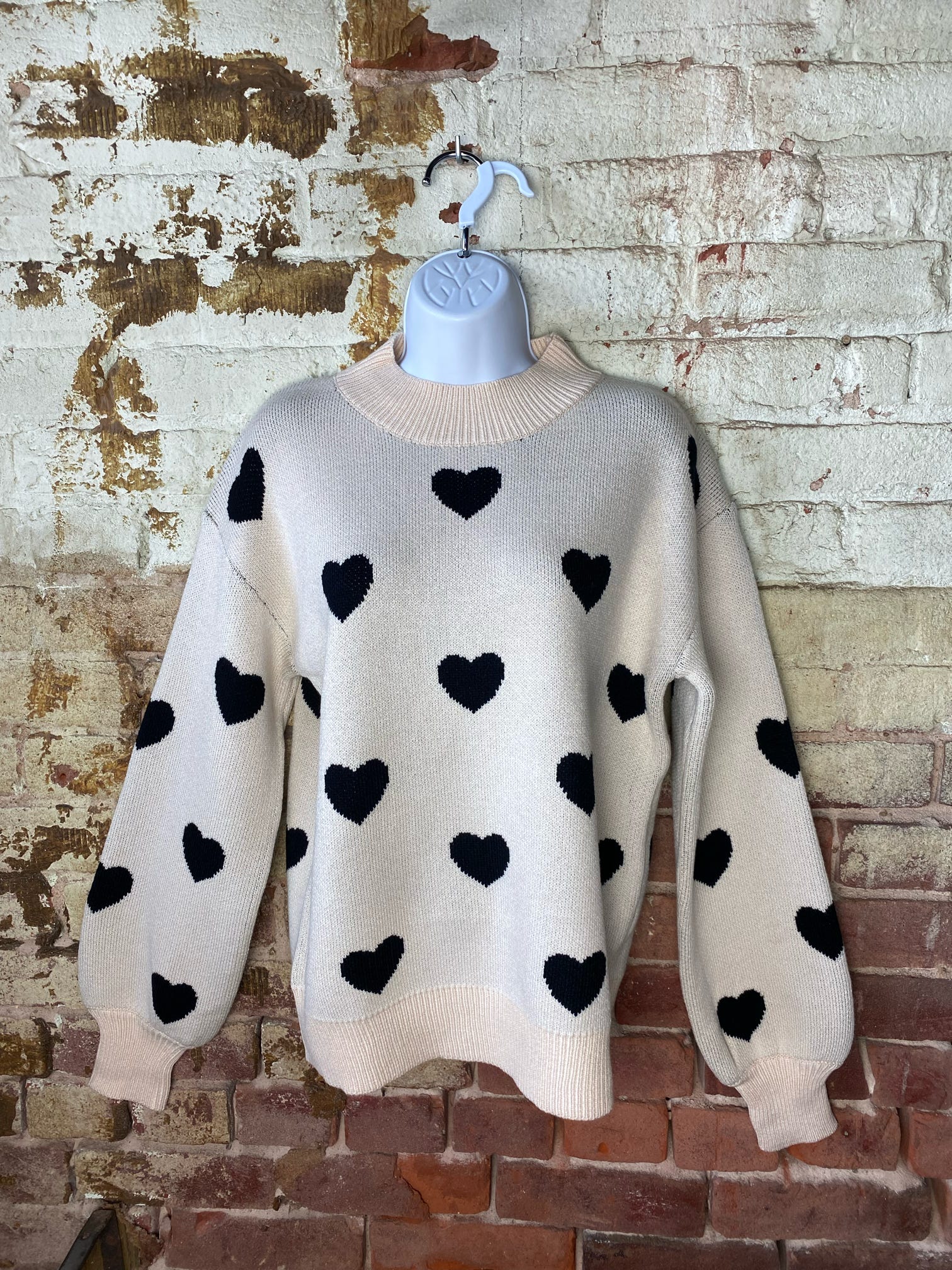 Spread the love with this adorable sweater. This cozy and stylish sweater is a must-have for any wardrobe. Featuring a soft, cream-colored base adorned with playful black hearts, it's the perfect blend of comfort and chic. With its relaxed fit, crew neckline, and long sleeves, you'll be feeling the love all day long. Pair it with your favorite jeans or skirt for a look that's effortlessly sweet. Stretchy and fits true to size. 50% Viscose, 28% Polyester, 22% Polyamide.