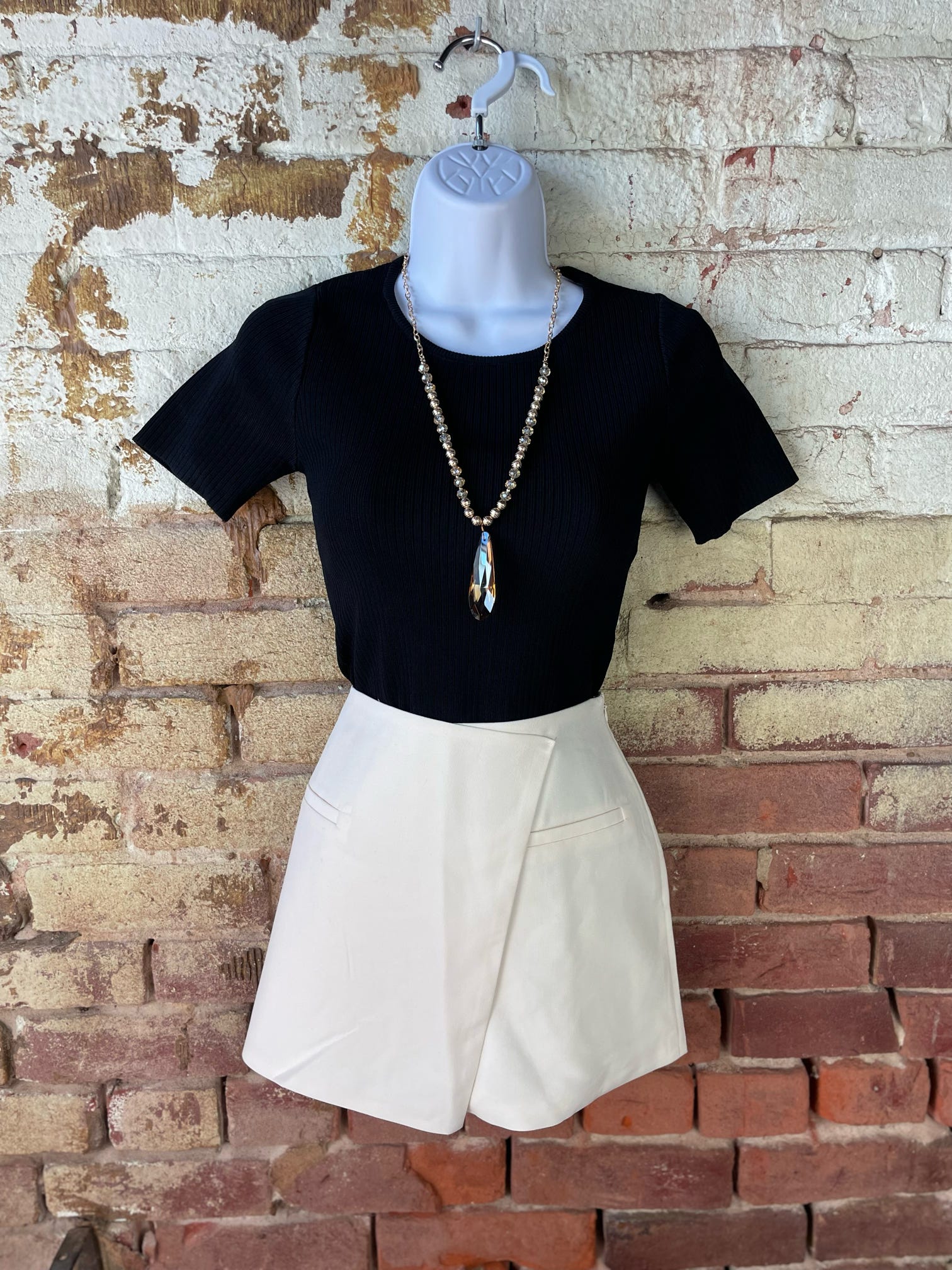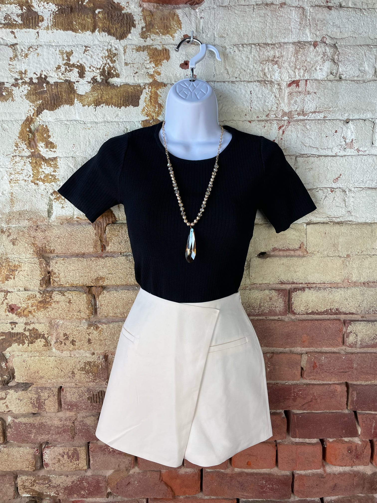 This off-white sKory offer a clean and versatile look, perfect for warm-weather days, or the holidays.The neutral color makes them easy to pair with a variety of tops, and the back pockets add a touch of practicality and style. Whether dressed up with a blouse or kept casual with a tee, this skirt are a wardrobe staple.