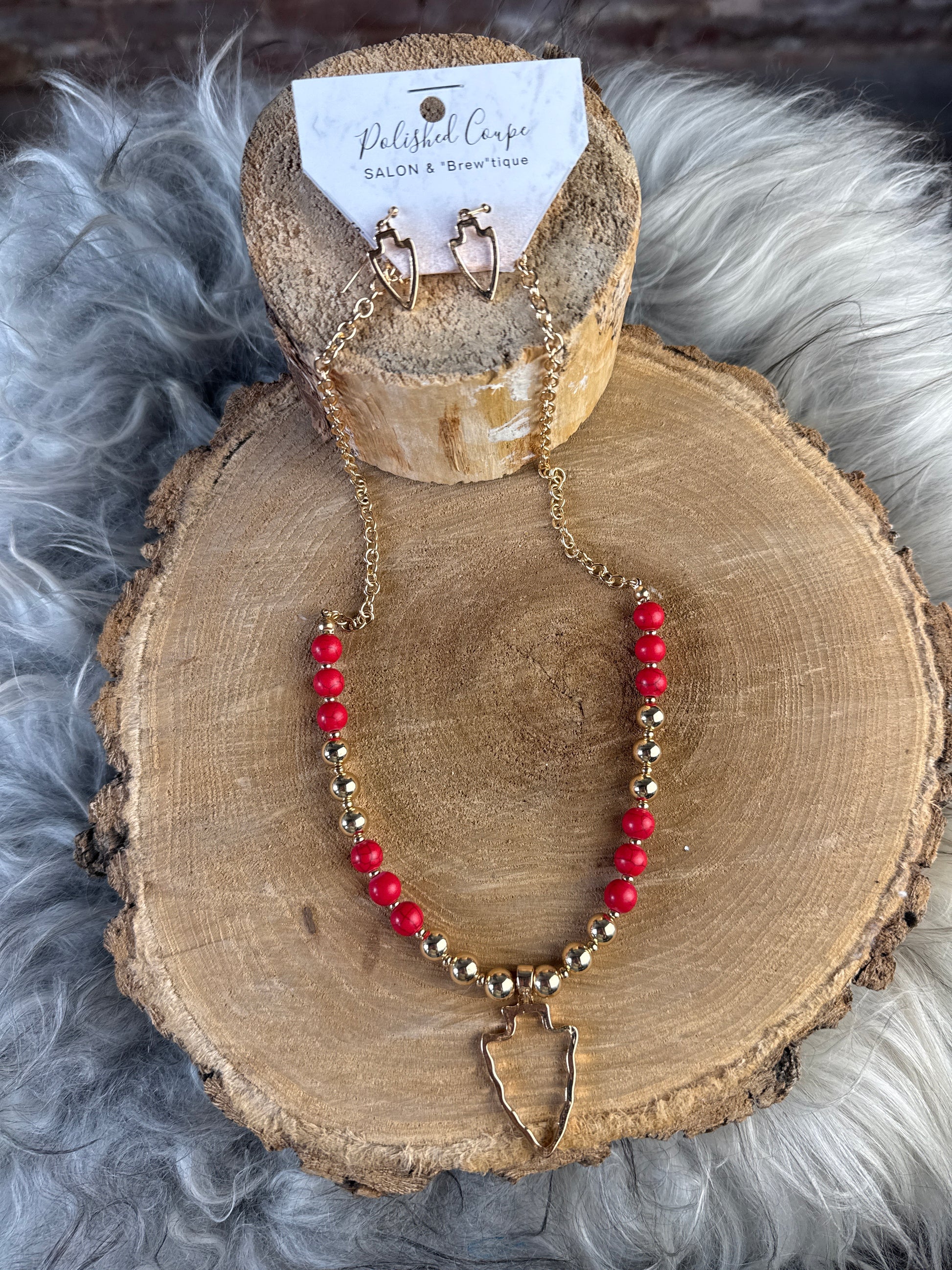 Mid length warm gold chain with red and gold beads accessorize with a dangle arrowhead also comes with matching S. hook arrowhead dangle earrings