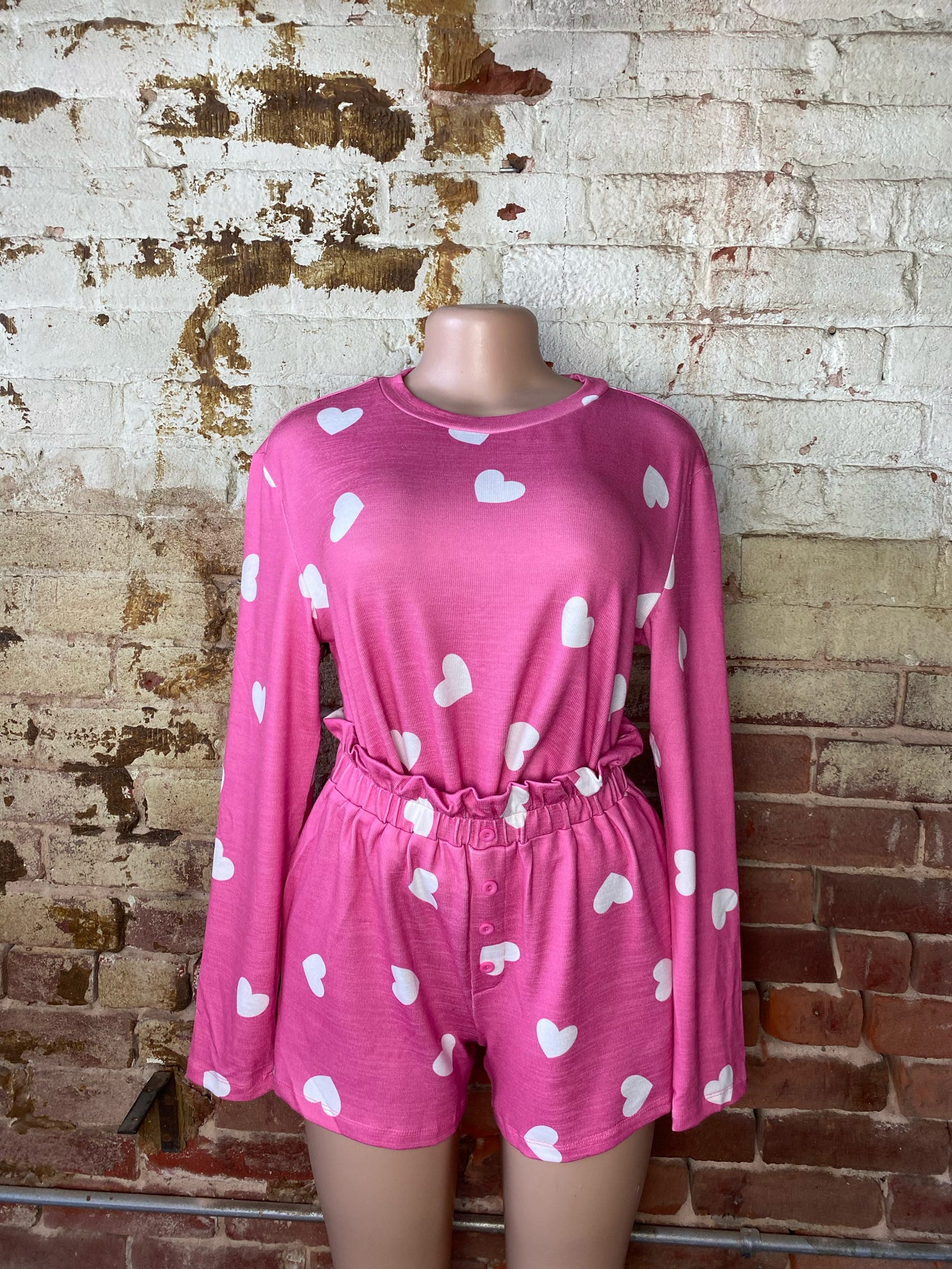 Snuggle up in our adorable lounge set. This super soft and comfy two-piece set features a long sleeve crew neck top and matching shorts, both adorned with playful white hearts on a vibrant pink background. Perfect for lounging at home or a sweet night's sleep, this set is sure to become your new favorite. Made from lightweight, breathable fabric, it offers ultimate comfort without sacrificing style. Fits true to size. 95% Polyester, 5% Elastane.