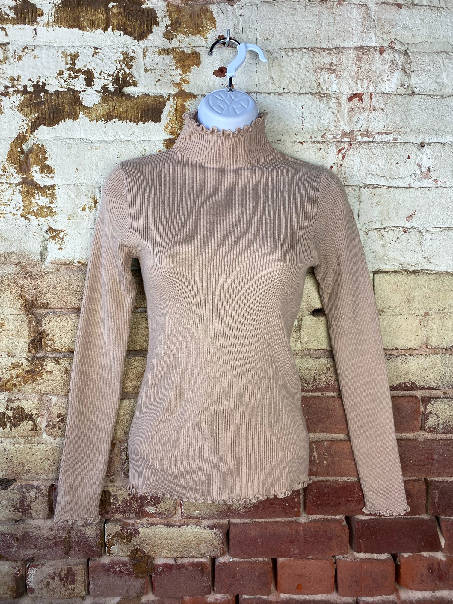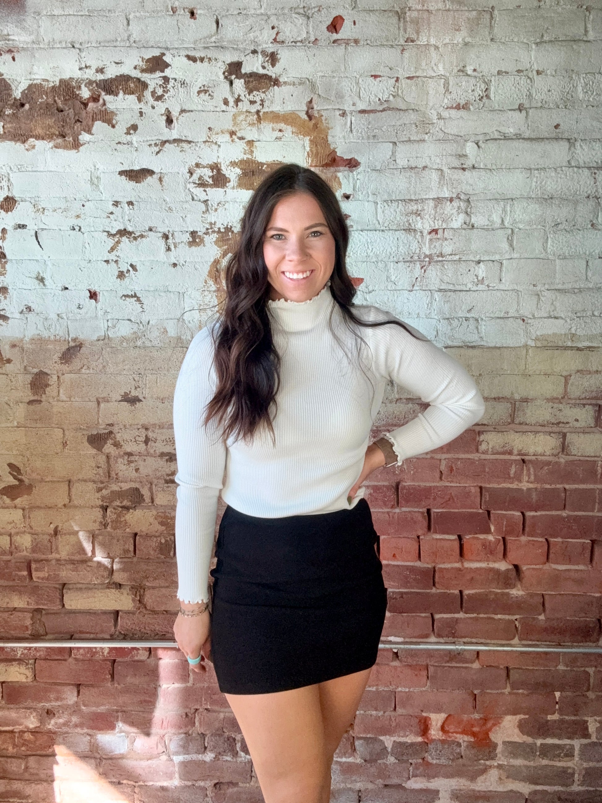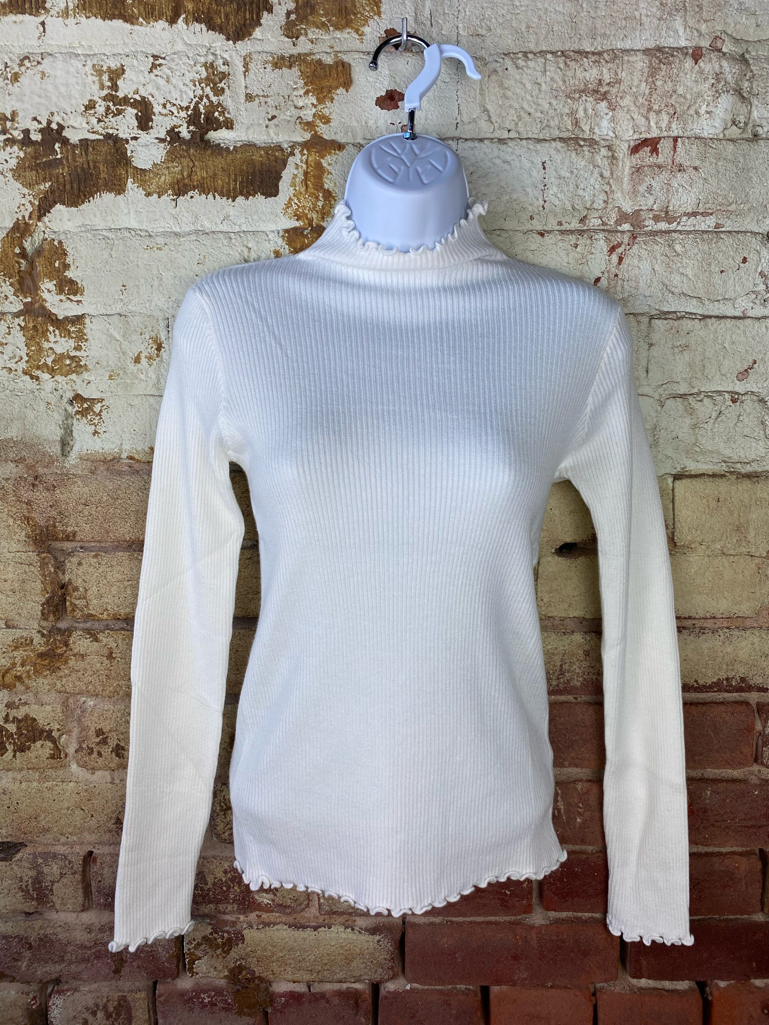 Add a touch of elegance to your wardrobe with this stunning white turtleneck sweater. Featuring a ribbed knit and delecate ruffle trim, this sweater is perfect for dressing up or down. The stretchy, comfortable fabric make it a must-have piece for any fashion-foreward woman. This sweater is sure to turn heads. Fits true to size. 55% Rayon 45% Nylon