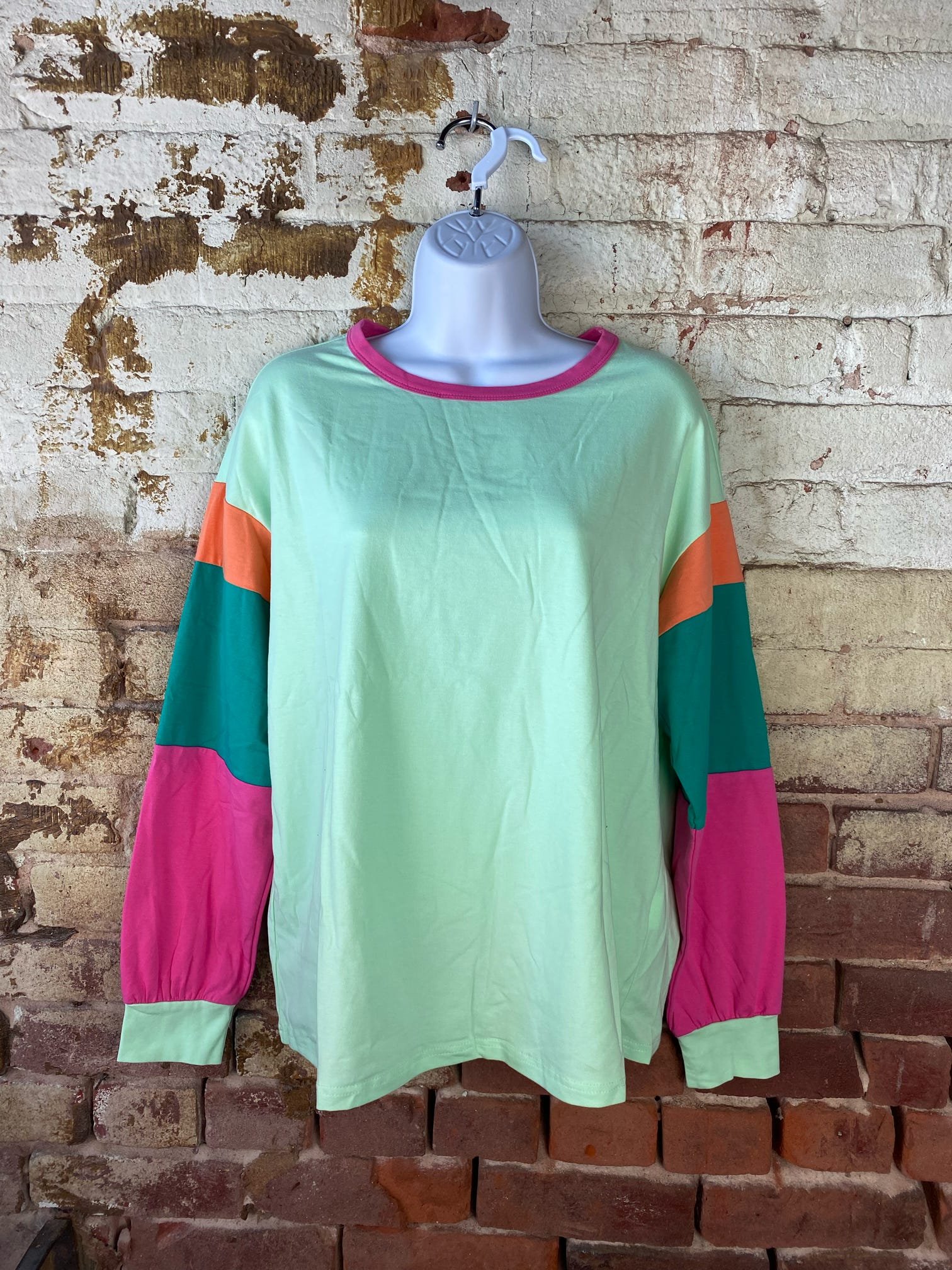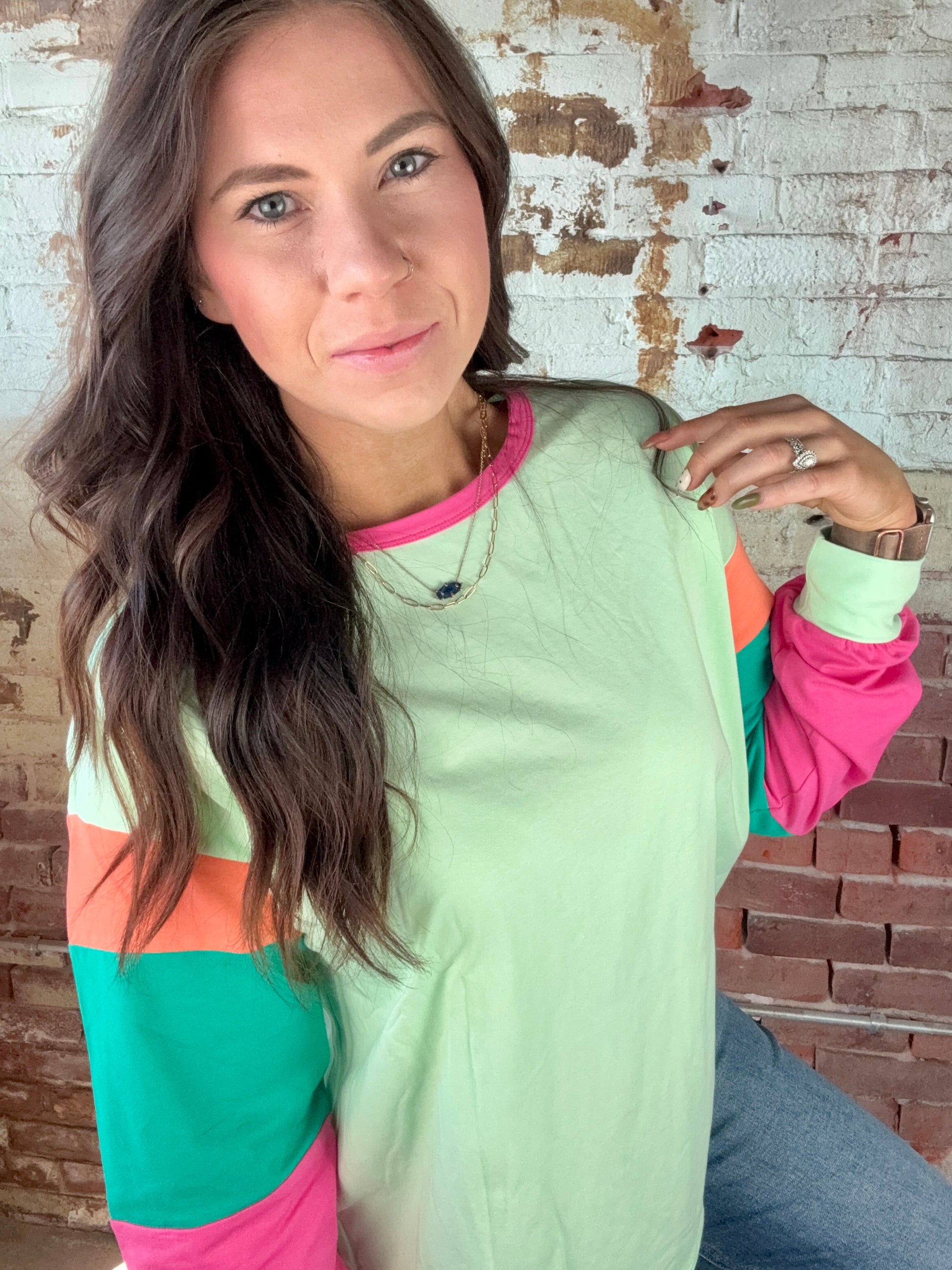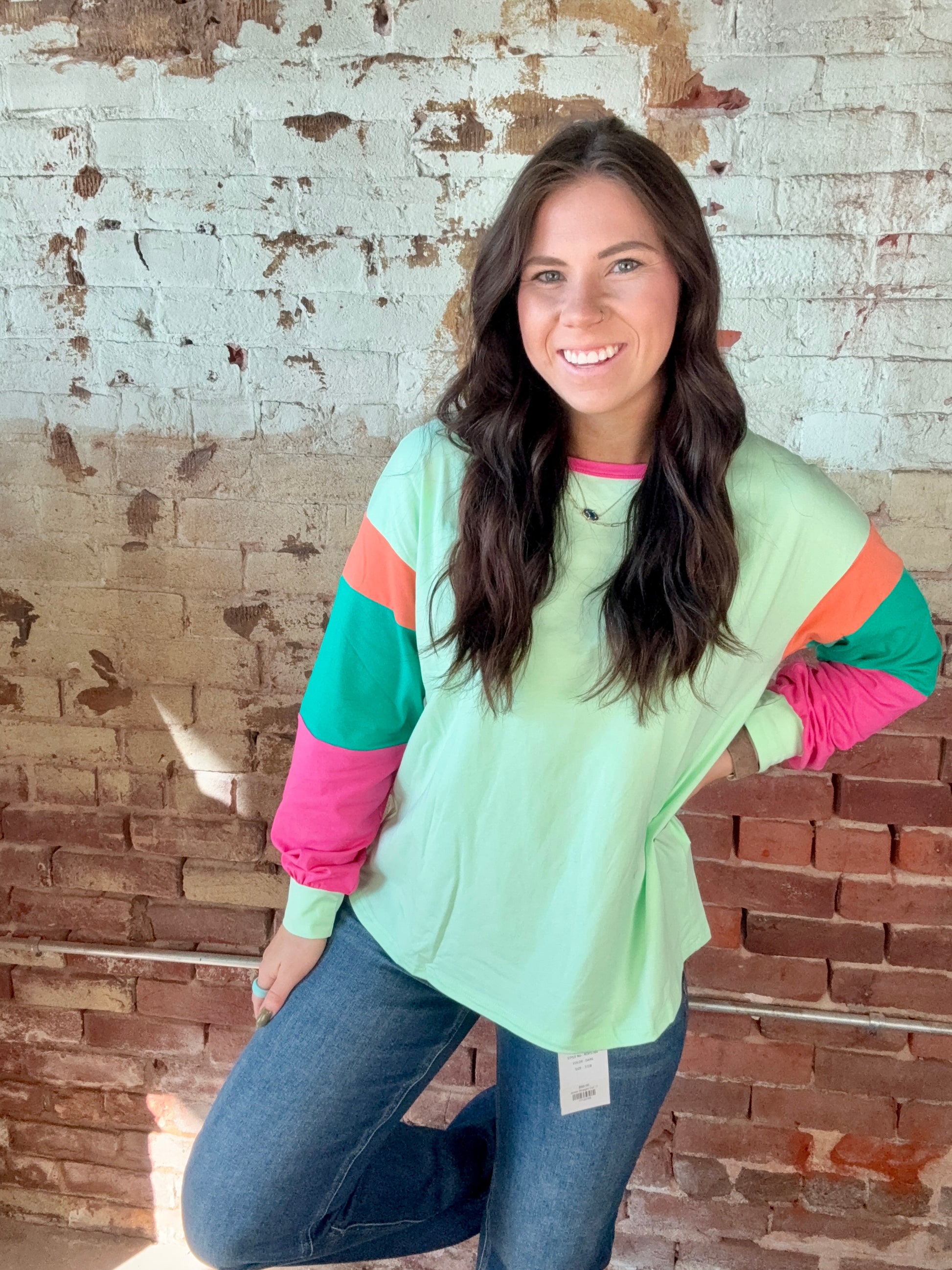 Walk in style with this vibrant color-block top. This eye-catching piece features a refreshing green base, complemented by playful pops of pink, orange, and teal. This comfortable, lightweight shirt is perfect for everday wear. Whether you're dressing up for a fun day out or keeping it casual, this top adds a touch or personality to any outfit. It's the perfect blend of chic and flair. Fits true to size. 95% Cotton 5% Elastane
