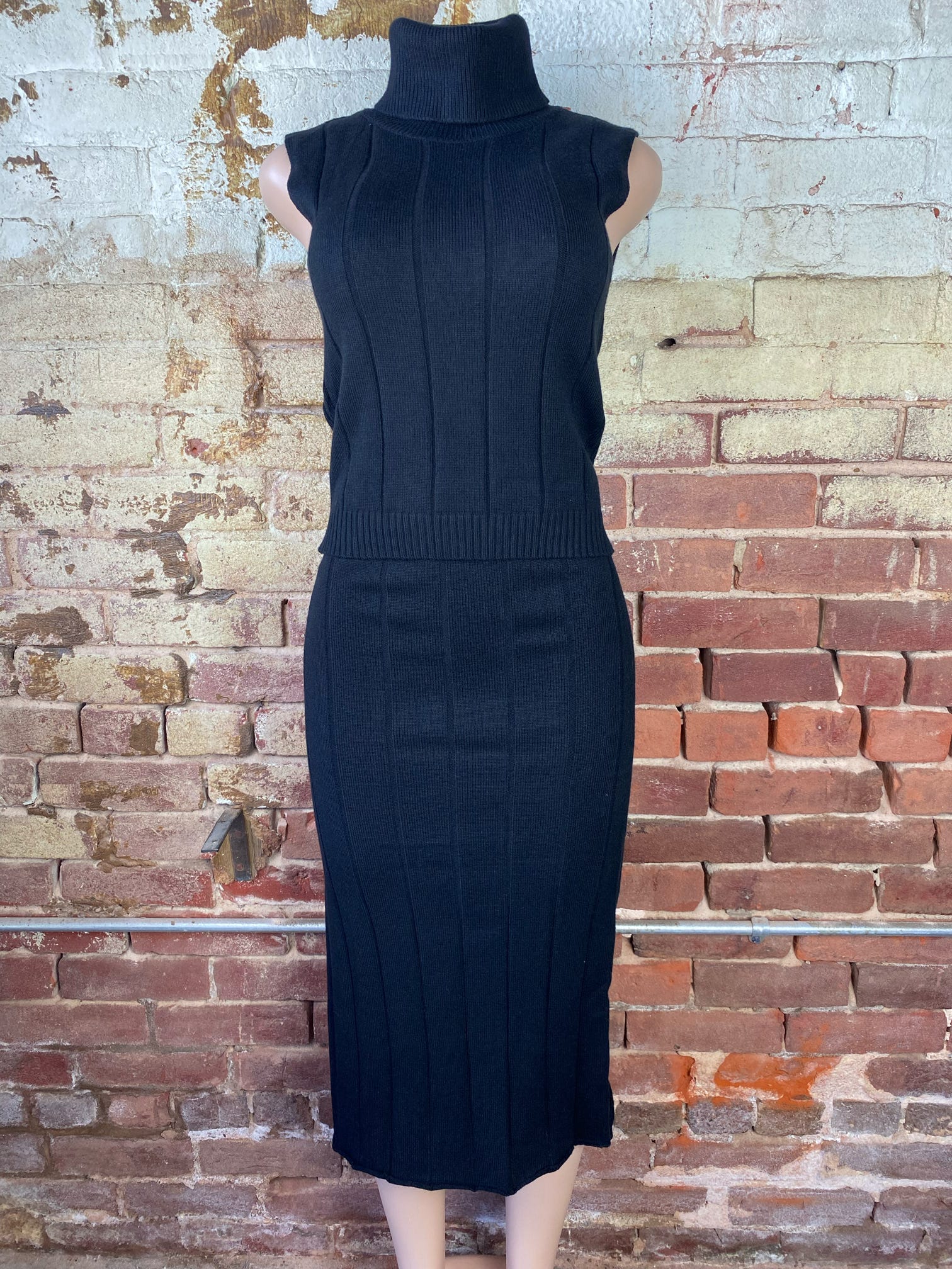 This black sleeveless turtleneck sweater and matching pencil skirt is the perfect addition to any wardrobe. The classic turtleneck design and sleeveless cut make it perfect for layering or wearing on its own. The vertical ribbing adds a touch of texture and sophistication, while the soft knit fabric ensures all-day comfort. This set is a must have staple to your wardrobe. Fits true to size. 50% Viscose 28% Polyester 22% Nylon