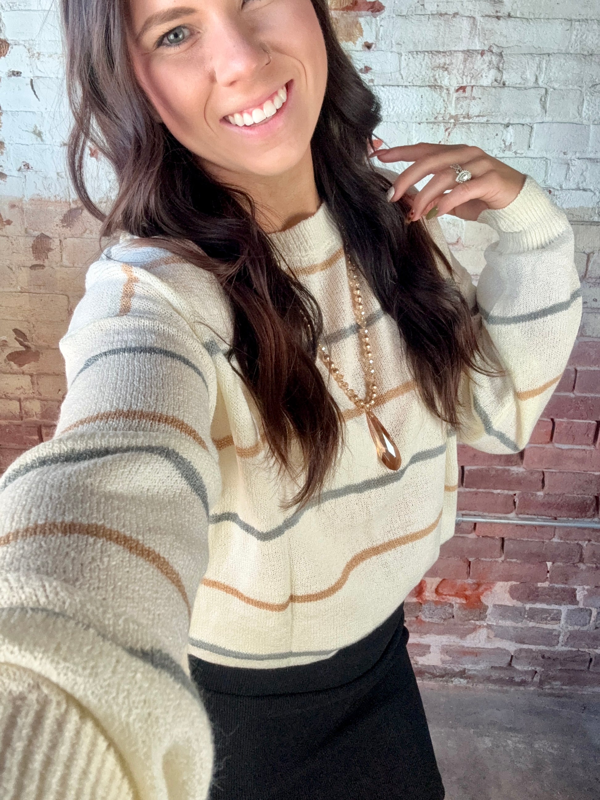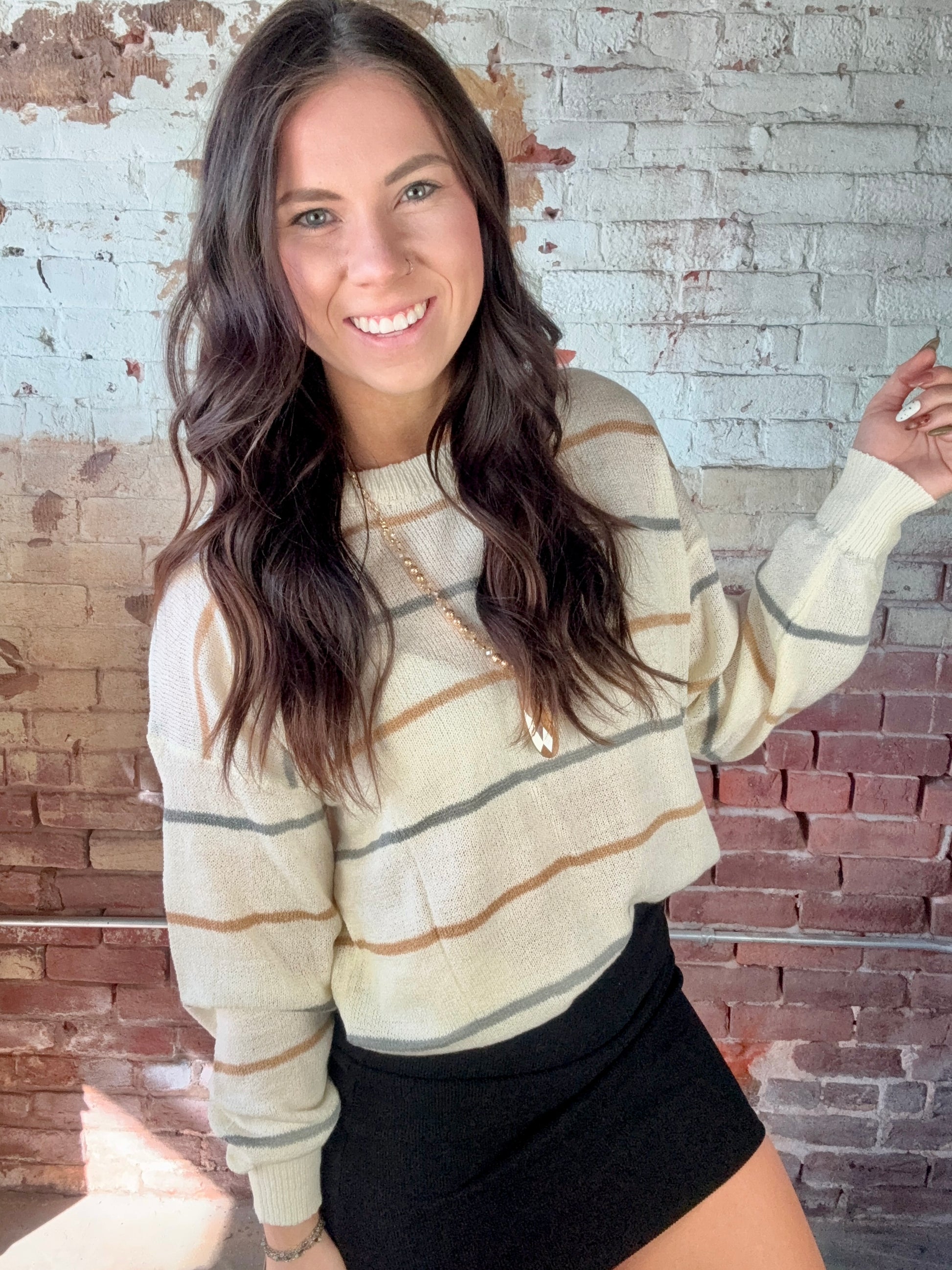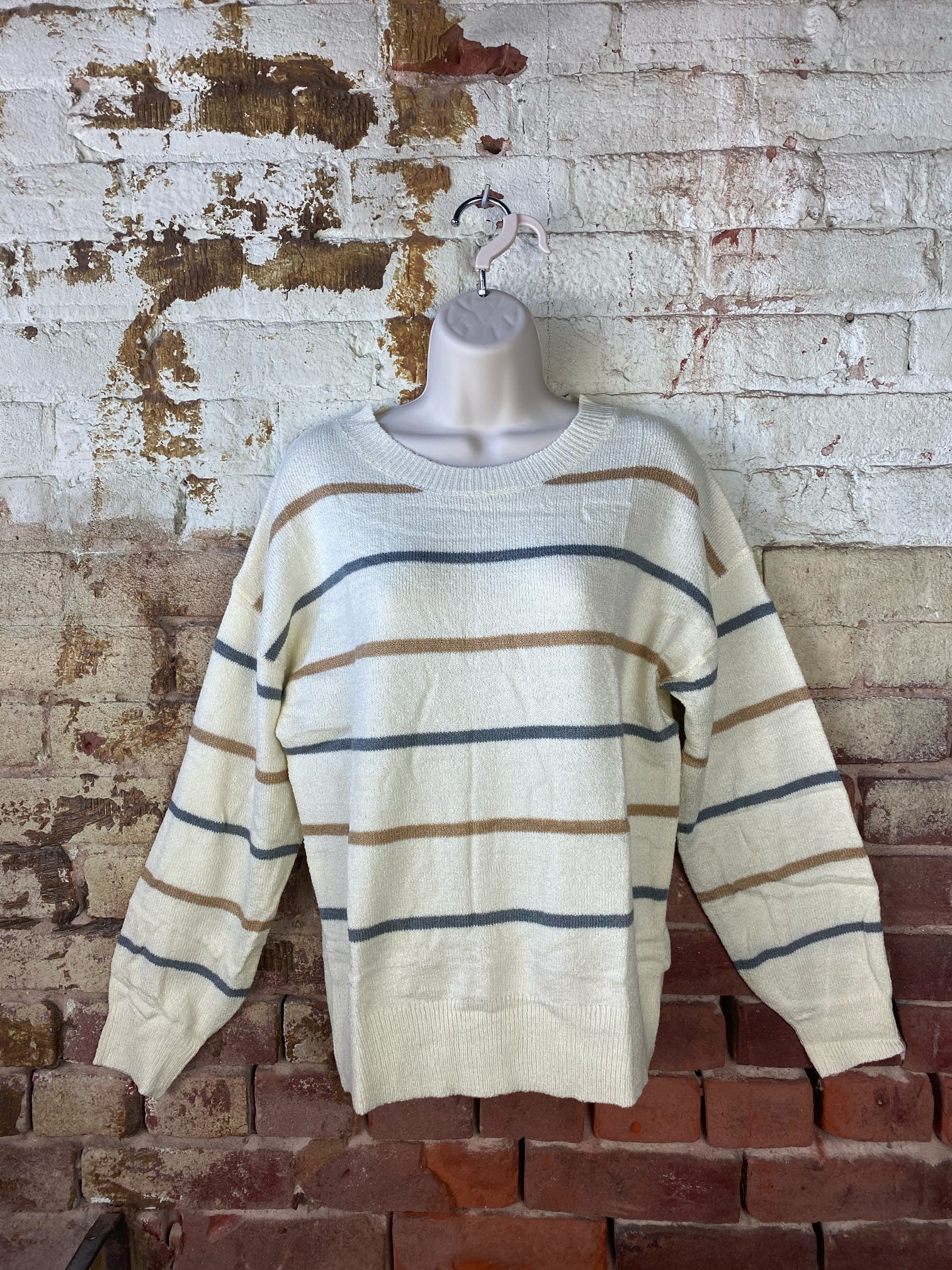 Wrap yourself up our beige Myka sweater. This cozy knit features a creamy, off-white base and accented by stripes of muted gray and caramel brown. Designed to bring a touch of effortless elegance to your closet. Whether you're enjoying a day out or a relaxed evening, this sweater is sure to become a beloved favorite. Breathable and fits true to size. 82% Acrylic 18% Polyamide