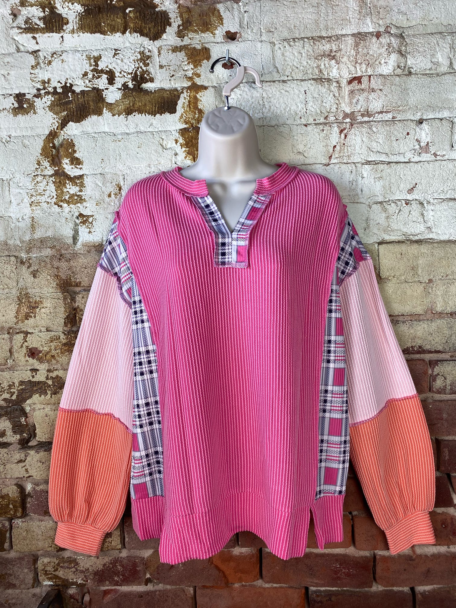 The Sam Colorblock top is a playful fusion of textures and hues. This unique piece features a ribbed body in vibrant pink, complemented by plaid accents and colorful sleeves for a touch of whimsy. The V-neckline adds a flattering detail, making it the perfect statement piece for any wardrobe. Embrace your unique style with this eye-catching top. Soft, lightweight, and fits true to size. 75% Polyester 20% Viscose 5% Elastane