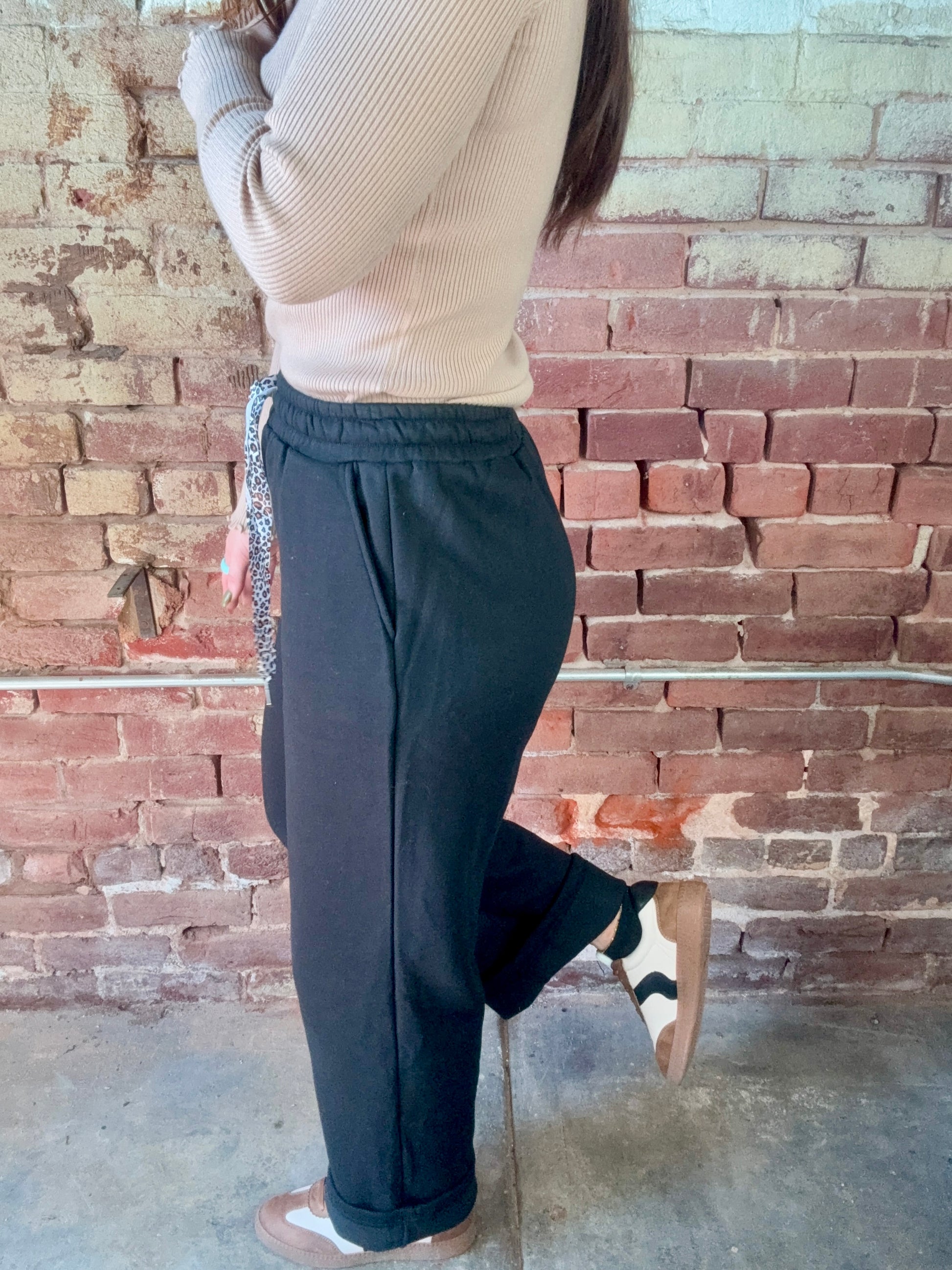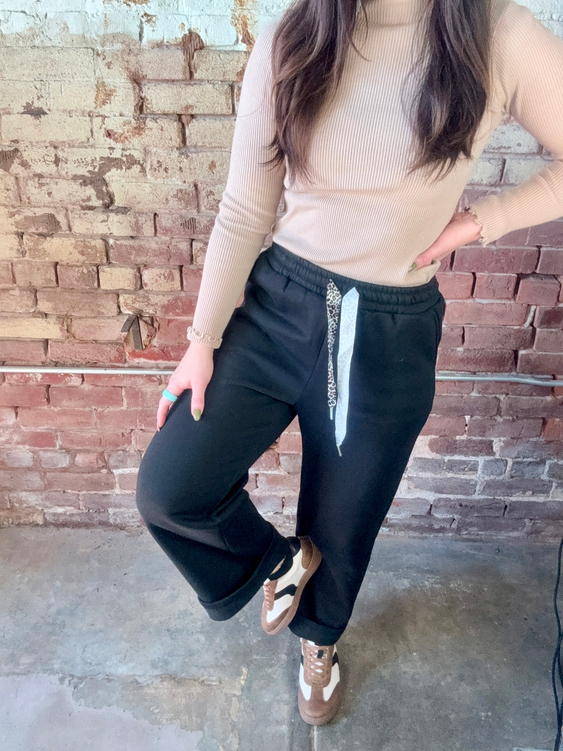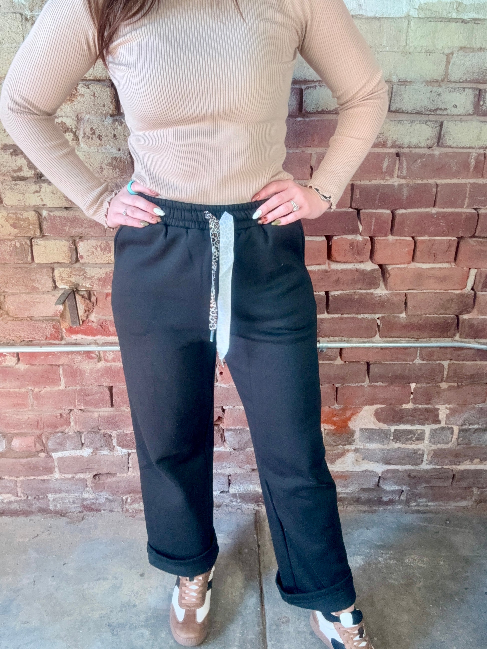 Effortlessly chic and comfortable, these black drawstring pants are a wardrobe essential. Crafted from a soft, high-quality fabric, they feature a relaxed fit and a comfortable elastic waistband. The leopard print drawstring adds a touch of flawless personality. Perfect for lounging at home or stepping out for arrands, these pants offer versatility and style. Fleece lined pant legs and fit true to size. 50% Polyester 50% Cotton